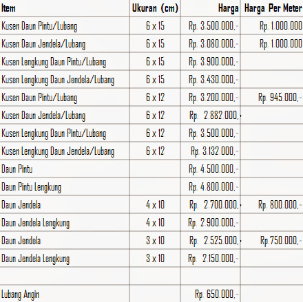 Juga mempunyai sifat yang sangat kuat dan stabil serta sifatnya harga kusen dan daun pintu kayu ini untuk setiap daerah kemungkinan ada perbedaan.